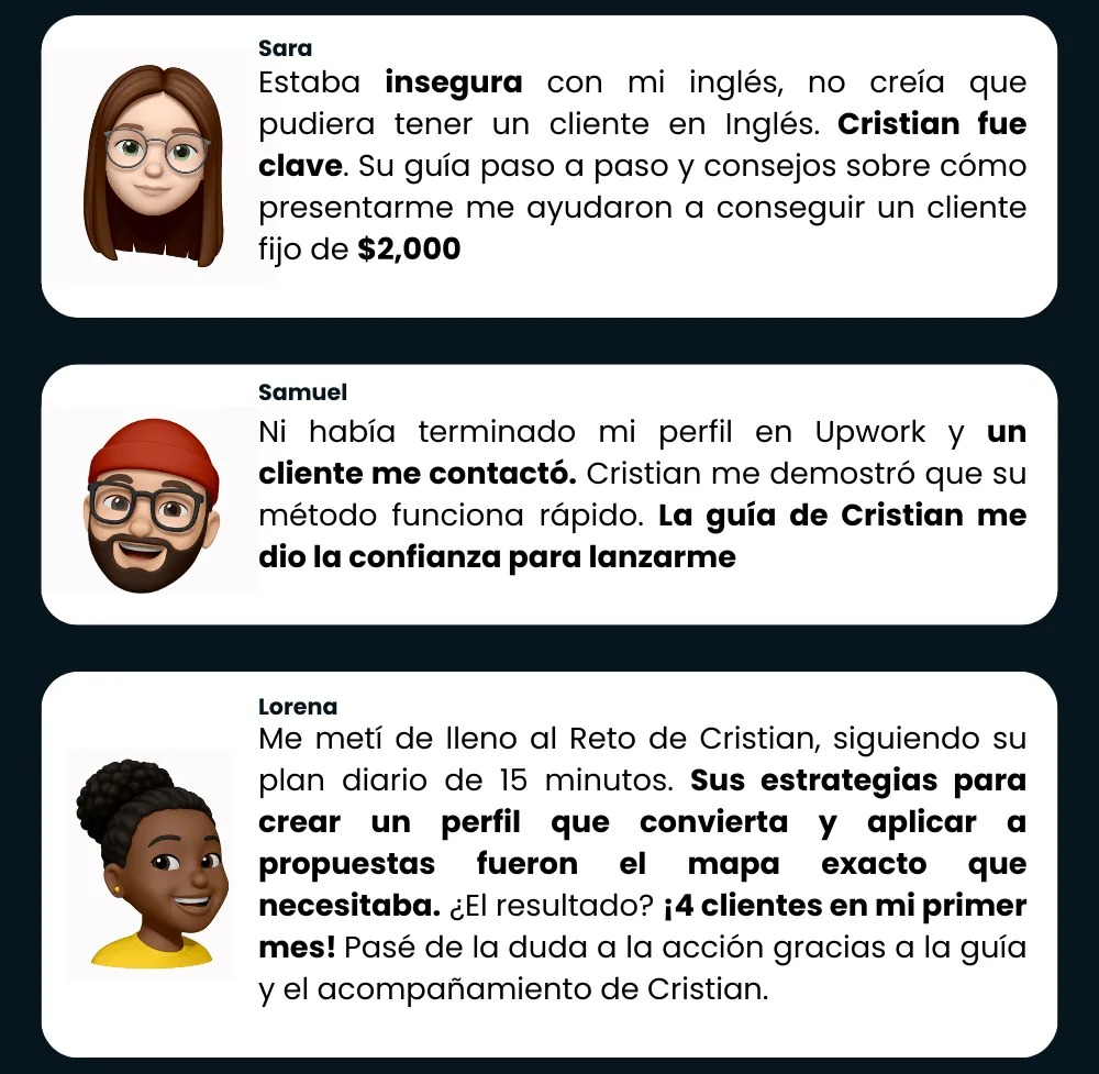 Este no es un curso teórico más. Es un Reto de Acción Diaria. Nació de mi frustración no tener trabajo y aun contando con la experiencia y el inglés, no me contrataron por 6 meses, en medio de la desesperación encontré Upwork y salí de estar atrapado en trabajos que no me llenaban ni el bolsillo ni el alma. Este Método se diseñó para ser rápido, práctico y directo al grano.